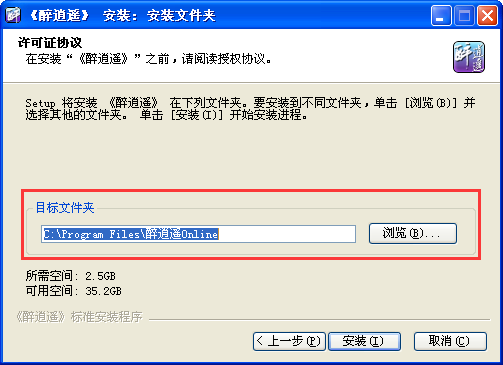 第三步:默认安装路径为C:\ProgramFiles\醉逍遥Online,玩家也可以使用【浏览】按钮,选中目标或直接输入路径