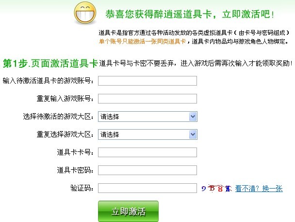 第一步:请登陆道具卡激活页面 http://jihuo.zuixiaoyao.com 下方输入游戏账号、选择大区、输入道具卡号与卡密