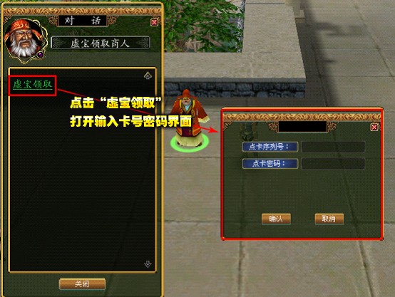 第二步:进入游戏,与游戏中各大城镇任意一个NPC“虚宝领取商人”进行对话,正确输入道具卡号与密码。